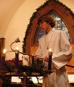 Lighting the candles of an Advent wreath in a church service