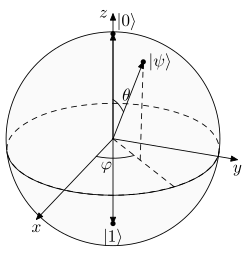 | ψ ⟩ = cos ⁡ ( θ / 2 ) | 0 ⟩ + e i ϕ sin ⁡ ( θ / 2 ) | 1 ⟩ = cos ⁡ ( θ / 2 ) | 0 ⟩ + ( cos ⁡ ϕ + i sin ⁡ ϕ ) sin ⁡ ( θ / 2 ) | 1 ⟩ {\displaystyle |\psi \rangle =\cos \left(\theta /2\right)|0\rangle \,+\,e^{i\phi }\sin \left(\theta /2\right)|1\rangle =\cos \left(\theta /2\right)|0\rangle \,+\,(\cos \phi +i\sin \phi )\,\sin \left(\theta /2\right)|1\rangle }  , where 0 ≤ θ ≤ π {\displaystyle 0\leq \theta \leq \pi }   and 0 ≤ ϕ < 2 π {\displaystyle 0\leq \phi <2\pi }  .