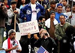 A "Chicano Power!" by M.E.Ch.A. CSULA is held up in a crowd (2006).