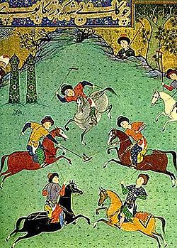Chovgan, Chowgan or Chogan (Persian: چوگان, romanized: čowgân) is a team sport with horses that originated in ancient Iran (Persia). It was considered an aristocratic game and held in a separate field, on specially trained horses. The game was widespread among the Asian peoples. It is played in Iran, Azerbaijan, Tajikistan, and Uzbekistan. It was later adopted in the Western World, known today as polo.