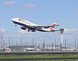A British Airways Boeing 747-400 departs London Heathrow International Airport. This is an example of a commercial aviation service.