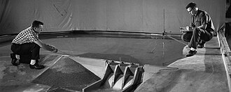Tennessee Valley Authority civil engineers monitoring hydraulics of a scale model of Tellico Dam