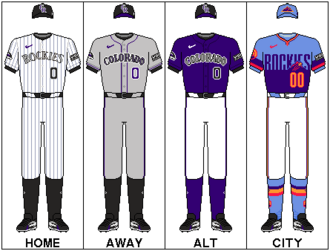 The Rockies' second "City Connect" uniform features a split between light blue and purple, paying homage to the transition between day and night over the Rocky Mountains. The jersey features blue skies and purple mountain majesty as the inspirations behind the color palette. Accents all over the uniform, cap, and branding use the red, yellow, and blue of the Colorado state flag. The Denver city flag is also featured on the lining inside the hat. It is the first pullover City Connect jersey.