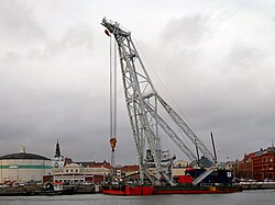 A crane vessel, crane ship, crane barge, or floating crane is a ship with a crane specialized in lifting heavy loads, typically exceeding 1,500 t (1,476 long tons; 1,653 short tons) for modern ships. The largest crane vessels are used for offshore construction.