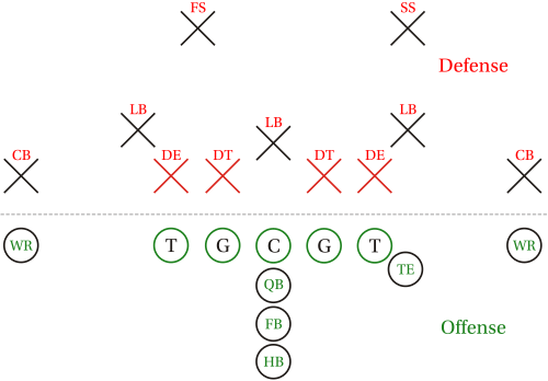The defensive line (DL) consists of one or two defensive tackles and two defensive ends who play outside the defensive tackles. The defensive line works with the linebackers to try to control the line of scrimmage. The 4-3 defense, most commonly used in the NFL, employs two defensive tackles (and a defensive line of four men, with three linebackers behind them), while the 3-4 defense uses just a single defensive tackle, called the nose tackle (and a defensive line of three men, with four linebackers behind them). Defensive ends in a typical 3-4 have responsibilities more similar to a 4-3 defensive tackle than 4-3 defensive ends.