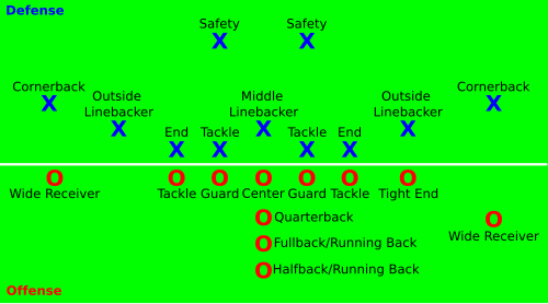Defensive formations are often known by a numerical code indicating the number of players at each position. The two most common formations are the 3–4 defense and the 4–3 defense, where the first number refers to the number of defensive linemen, and the second number refers to the number of linebackers (the number of defensive backs can be inferred, since there must be eleven players on the field). Thus, a 3–4 defense consists of three defensive linemen (usually a nose tackle and two defensive ends), four linebackers, and four defensive backs (two cornerbacks, a strong safety, and a free safety). Some defensive formations will directly indicate the number of defensive backs. The 3–3–5 defense, for instance, has 3 defensive linemen, 3 linebackers, and 5 defensive backs.