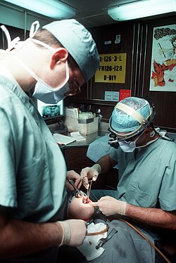 ![]() A dentist treats a patient with the help of a dental assistant. | |
