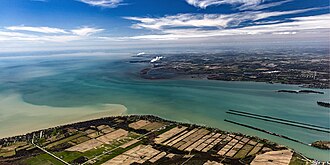 ![]() Southern end as it enters Lake Erie with Canada in the foreground and the U.S. in the background | |