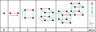 From left to right: a square, a cube and a tesseract. The square is two-dimensional (2D) and bounded by one-dimensional line segments; the cube is three-dimensional (3D) and bounded by two-dimensional squares; the tesseract is four-dimensional (4D) and bounded by three-dimensional cubes.