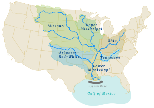 The Mississippi River drains the largest area of any U.S. river, much of it agricultural regions. Agricultural runoff and other water pollution that flows to the outlet is the cause of the hypoxic or dead zone in the Gulf of Mexico.