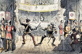 Morality plays (a modern term) emerged as a distinct dramatic form around 1400 and flourished in the early Elizabethan era in England. Characters were often used to represent different ethical ideals. Everyman, for example, includes such figures as Good Deeds, Knowledge and Strength, and this characterisation reinforces the conflict between good and evil for the audience. The Castle of Perseverance (c. 1400–1425) depicts an archetypal figure's progress from birth through to death. Horestes (c. 1567), a late "hybrid morality" and one of the earliest examples of an English revenge play, brings together the classical story of Orestes with a Vice from the medieval allegorical tradition, alternating comic, slapstick scenes with serious, tragic ones. Also important in this period were the folk dramas of the Mummers Play, performed during the Christmas season. Court masques were particularly popular during the reign of Henry VIII.