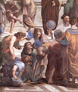 Detail from Raphael's The School of Athens featuring a Greek mathematician – perhaps representing Euclid or Archimedes – using a compass to draw a geometric construction.