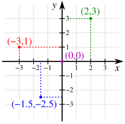 In mathematics, analytic geometry (also called Cartesian geometry) describes every point in two-dimensional space by means of two coordinates. Two perpendicular coordinate axes are given which cross each other at the origin. They are usually labeled x and y. Relative to these axes, the position of any point in two-dimensional space is given by an ordered pair of real numbers, each number giving the distance of that point from the origin measured along the given axis, which is equal to the distance of that point from the other axis.