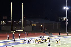 A team preparing to kick a field goal through the uprights at left