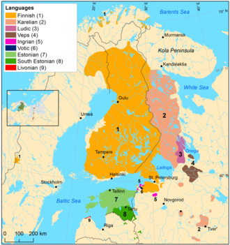 The Finnic, or Baltic Finnic, languages constitute a branch of the Uralic language family spoken around the Baltic Sea by the Baltic Finnic peoples. There are around seven million speakers, who live mainly in Finland and Estonia.
