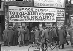 A fire sale is the sale of goods at extremely discounted prices. The term originated in reference to the sale of goods at a heavy discount due to fire damage. It may or may not be defined as a closeout, the final sale of goods to zero inventory. They are said to occur in the financial markets when bidders who value assets highly are prevented from bidding on them, depressing the average selling price below what it otherwise would be. This lowering of the price can cause even further issues because it may be inaccurately perceived as signalling negative information.