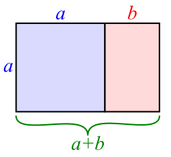 A golden rectangle with long side a + b and short side a can be divided into two pieces: a similar golden rectangle (shaded red, right) with long side a and short side b and a square (shaded blue, left) with sides of length a. This illustrates the relationship ⁠a + b/a⁠ = ⁠a/b⁠ = φ.