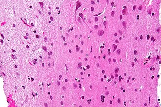 Micrograph showing grey matter, with the characteristic neuronal cell bodies (dark shade of pink), and white matter with its characteristic fine meshwork-like appearance (left of image; lighter shade of pink). HPS stain.