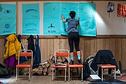 ![]() A woman hangs posters with the Haida words for various body parts | |