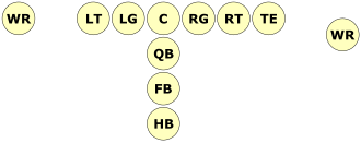 The formation begins with the usual 5 offensive linemen (2 offensive tackles, 2 guards, and a center), the quarterback under center, and two backs in-line behind the quarterback. The base variant adds a tight end to one side of the line and two wide receivers, one at each end of the line.
