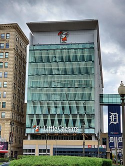 On December 10, 2014, Little Caesars announced plans for a new eight-story, 205,000-square-foot Global Resource Center to be built at Woodward Avenue and Columbia Street in downtown Detroit. Intended to double the size of Little Caesars World Headquarters Campus, the new building's location was chosen near the Fox Office Center building, which houses both the Fox Theatre, and 186,000 square feet of office space for Little Caesars, and other Ilitch-affiliated ventures. An overhead pedestrian bridge over Columbia Street was planned to connect the Fox with the new Little Caesars Global Resource Center and workspace for an additional 600 jobs to be brought to Detroit over time. On January 31, 2016, it was announced that the proposed new Little Caesars Pizza Global Resource Center had grown by one floor to be a nine-story building at Woodward and Columbia Street. The building was scheduled to be completed in 2018, but in October of that year, was pushed back due to construction delays.