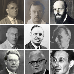 Collage of prominent figures associated with logical positivism / logical empiricism. From left to right, top to bottom: Moritz Schlick, Rudolf Carnap, Otto Neurath, Hans Hahn, Friedrich Waismann, Herbert Feigl, Hans Reichenbach, Carl Gustav Hempel, and A. J. Ayer.