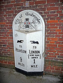 ![]() A milestone in the City of Westminster showing the distance from Kensington Road to Hounslow and Hyde Park Corner in miles | |