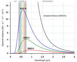 Classical physics (Rayleigh–Jeans law, black line) failed to explain black-body radiation – the so-called ultraviolet catastrophe. The quantum description (Planck's law, colored lines) is said to be modern physics.