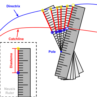 Point P is called the pole of the neusis, line l the directrix, or guiding line, and line m the catch line. Length a is called the diastema (Greek: διάστημα, lit. 'distance').