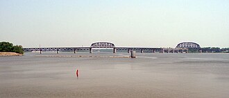 ![]() The widest point on the Ohio River is just north of downtown Louisville, where it is one mile (1.6 km) wide. Indiana is on the right towards the flood gates, Kentucky on the left, towards the locks. The jetty on the left is the entrance to the Louisville and Portland Canal. | |