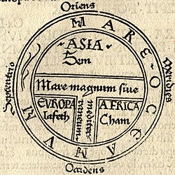 This T and O map, from the first printed version of Isidore's Etymologiae (Augsburg, 1472), identifies the three known continents (Asia, Europe and Africa) as respectively populated by descendants of Sem (Shem), Iafeth (Japheth) and Cham (Ham).