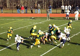 The option offense can be run out of various formations. Here, Morris Knolls High School of Denville, New Jersey is running the veer option.