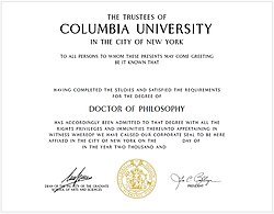 ![]() Doctor of Philosophy degree certificate of Columbia University | |