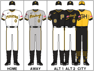 In 2023, the Pirates retired the camo home alternate to comply with the new "4+1" rule, restricting teams to a home, away, two alternate uniforms and a City Connect uniform. The Pirates continued to wear the camo cap on occasion with the home white uniform. They also unveiled their City Connect uniform, featuring a gold top and black pants with a gold "P" cap with black brim. The jersey itself features the abbreviation of Pittsburgh "PGH". A closer look of the jersey feature the Three Elements. The inverted "Y", representing the three rivers that meet in Pittsburgh (Allegheny, Monongahela, and Ohio). The astroid, or the diamond shape star represents the famous "Steelmark" logo and the Check or the Checkbox, represents the Seal of Pittsburgh.