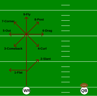 A route is a pattern or path that a receiver in gridiron football runs to get open for a forward pass. Routes are usually run by wide receivers, running backs and tight ends, but other positions can act as a receiver given the play.