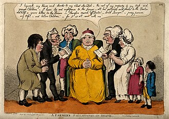 A 19th century etching of a farmer consulting with his doctor, vicar and lawyer