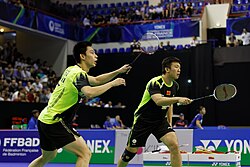 Liu Xiaolong and Qiu Zihan playing badminton at the 2013 French Open.