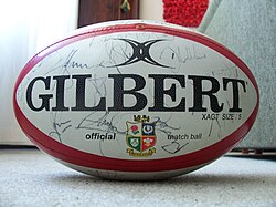 A rugby ball is an elongated ellipsoidal ball used in both codes of rugby football. Its measurements and weight are specified by World Rugby and the Rugby Leagu