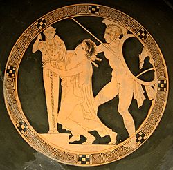 Ajax the Younger violates Cassandra's sanctuary at the Palladium: tondo of an Attic cup, ca. 440–430 BCE