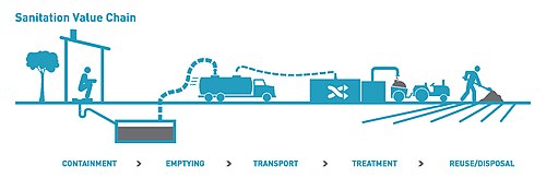 Providing sanitation to people requires attention to the entire system, not just focusing on technical aspects such as the toilet, fecal sludge management or the wastewater treatment plant. The "sanitation chain" involves the experience of the user, excreta and wastewater collection methods, transporting and treatment of waste, and reuse or disposal. All need to be thoroughly considered.