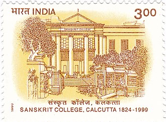 ![]() ![]() (top) A 19th-century illustrated Sanskrit manuscript from the Bhagavad Gita, composed c. 400-200 BCE. (bottom) The 175th-anniversary stamp of Sanskrit College, Calcutta, the third oldest. The oldest college was founded as Benares Sanskrit College in 1791. | |