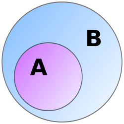 A is a subset of B (denoted A ⊆ B {\displaystyle A\subseteq B} {\displaystyle A\subseteq B}) and, conversely, B is a superset of A (denoted B ⊇ A {\displaystyle B\supseteq A} {\displaystyle B\supseteq A})
