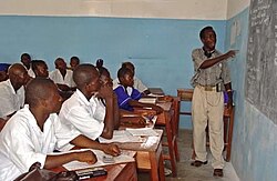 ![]() A teacher in a classroom at a secondary school in Pendembu, Sierra Leone | |