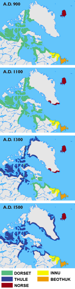 The different cultures in Greenland, Labrador, Newfoundland and the Canadian arctic islands between 900 AD and 1500 AD
