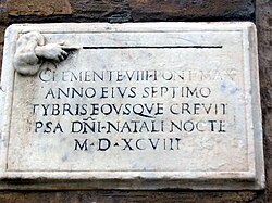 Rome flood marker, 1598, set into a pillar of the Santo Spirito Hospital near Basilica di San Pietro.