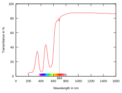 Transmittance of ruby in optical and near-IR spectra. Note the two broad blue and green absorption bands and one narrow absorption band on the wavelength of 694 nm, which is the wavelength of the ruby laser.
