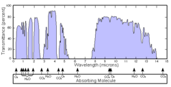 Earth's atmospheric transmittance over 1 nautical mile sea level path (infrared region). Because of the natural radiation of the hot atmosphere, the intensity of radiation is different from the transmitted part.