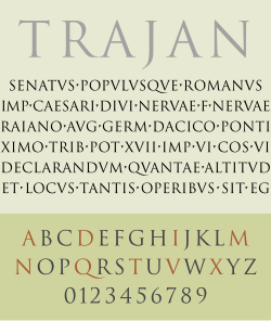 A specimen sheet of the Trajan typeface, which is based on the letter forms of capitalis monumentalis or Roman square capitals used for the inscription at the base of Trajan's Column, from which the typeface takes its name