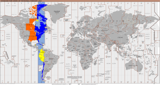 UTC−05:00: blue (January), orange (July), yellow (year-round), light blue (sea areas)