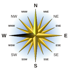 West is one of the four cardinal directions or points of the compass. It is the opposite direction from east and is the direction in which the Sun sets on the Earth.